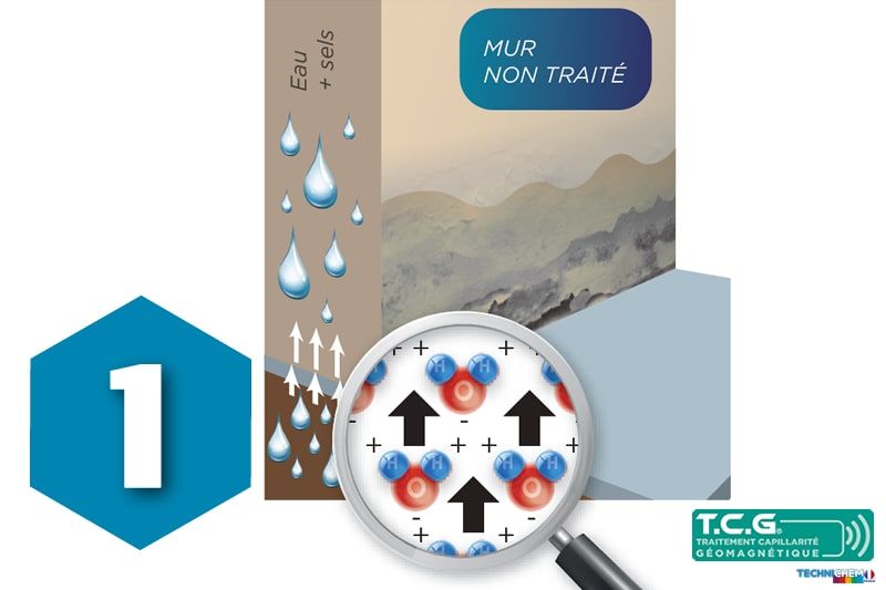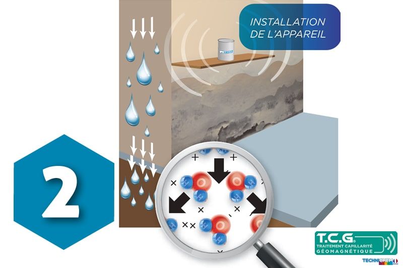 Le procédé T.C.G. consiste à capter l’énergie qu’utilisent les molécules d’eau pour monter dans les structures et à la renvoyer en opposition afin de dépolariser les murs et supprimer toutes charges électriques.