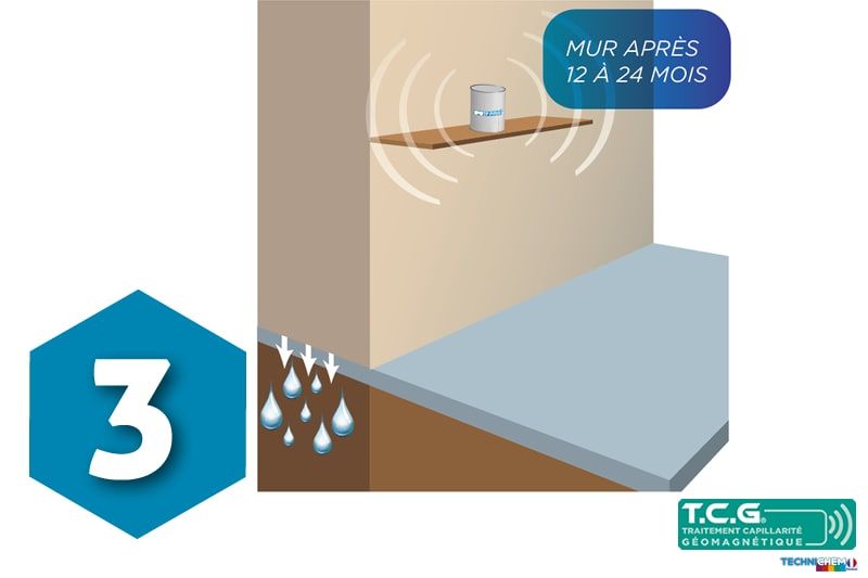 L’assèchement des murs s’effectue ensuite par évaporation naturelle de l’humidité (entre 12 et 24 mois selon les spécificités du bâtiment).